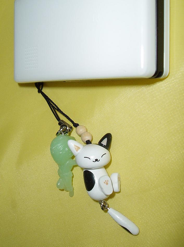 右の画像は、携帯につけた木製の「お昼寝にゃんこ」ストラップです。